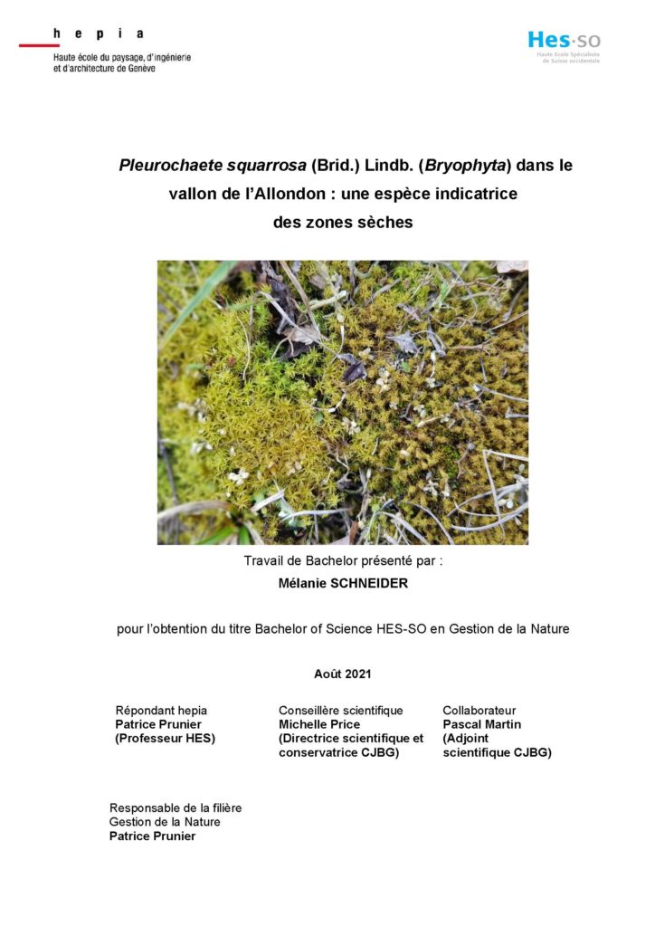 La lauréate du Prix de botanique de la SBG 2021 est Mélanie Schneider pour son travail de Bachelor à la Haute école du paysage, d’ingénierie et d’architecture de Genève intitulé « Pleurochaete squarrosa (Brid.) Lindb. (Bryophyta) dans le vallon de l’Allondon : une espèce indicatrice des zones sèches »